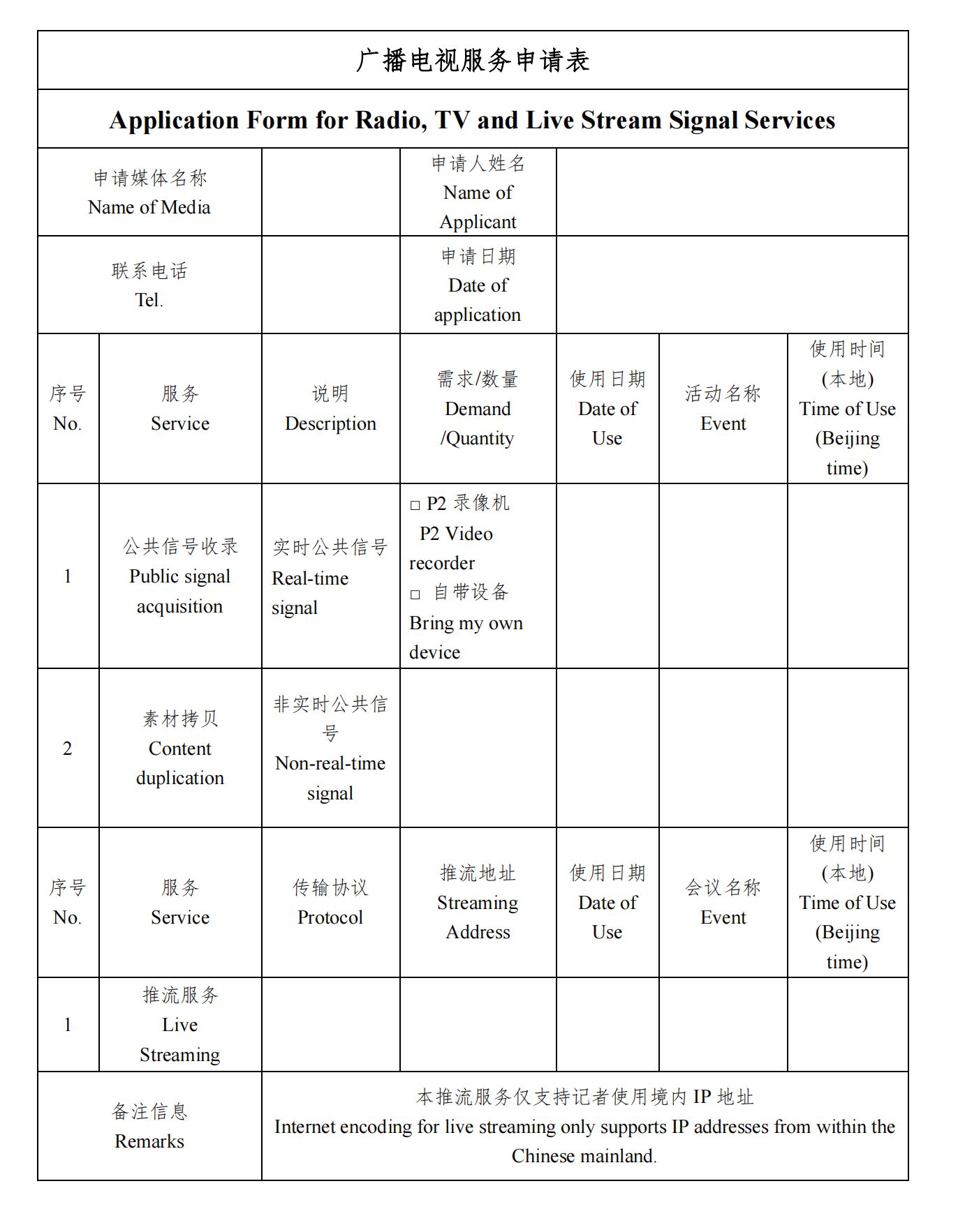 1. 公共信号技术服务需到新闻中心现场一层媒体工作区填写《广播电视服务申请表》进行预订预约。由于场地线缆数量有限,遵循“先到先得”的原则。
