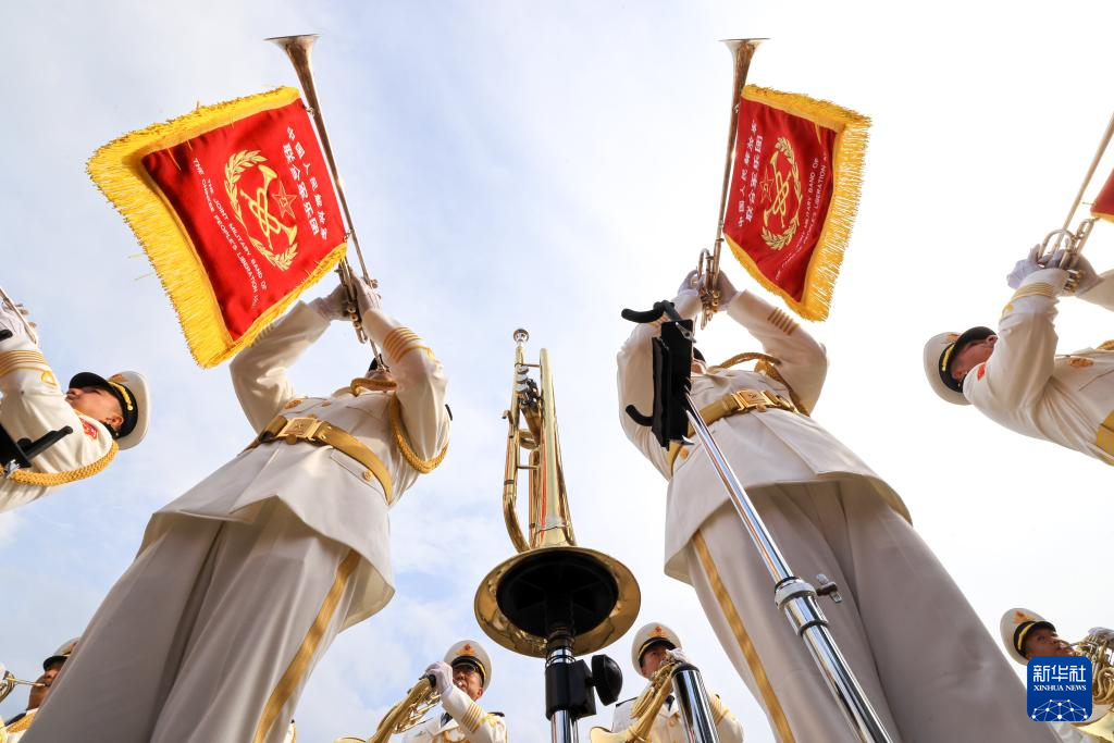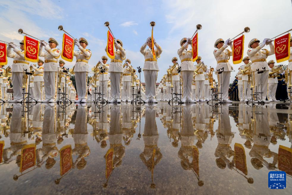 中国人民解放军联合军乐团在进行训练(8月12日摄)。