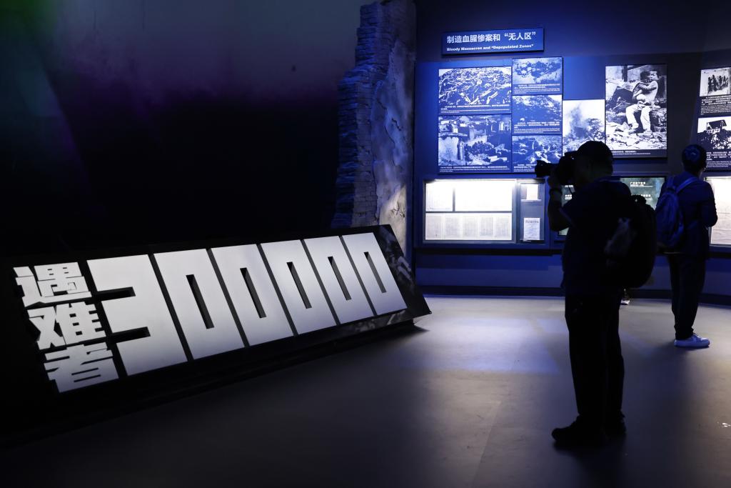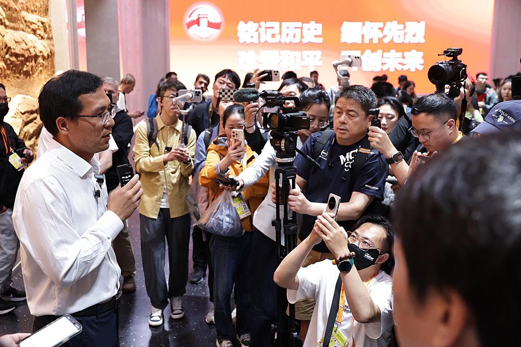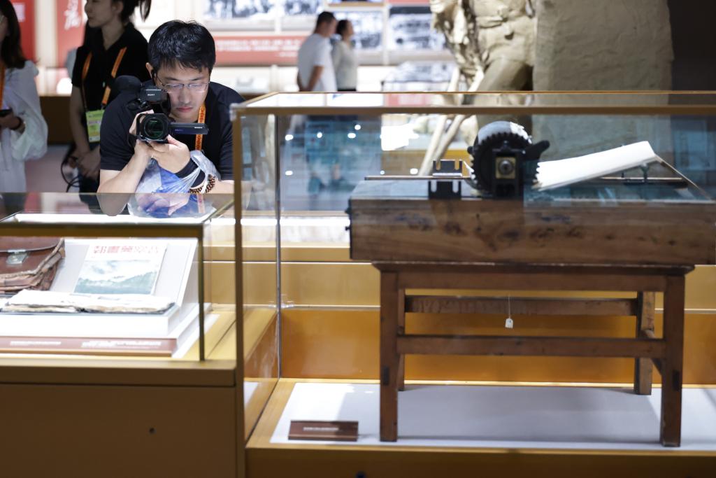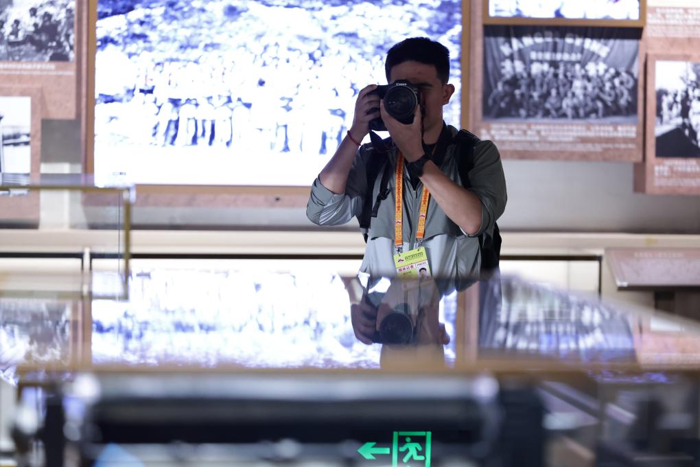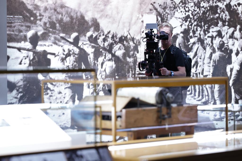 8月27日,中外媒体记者在中国人民抗日战争纪念馆内采访。