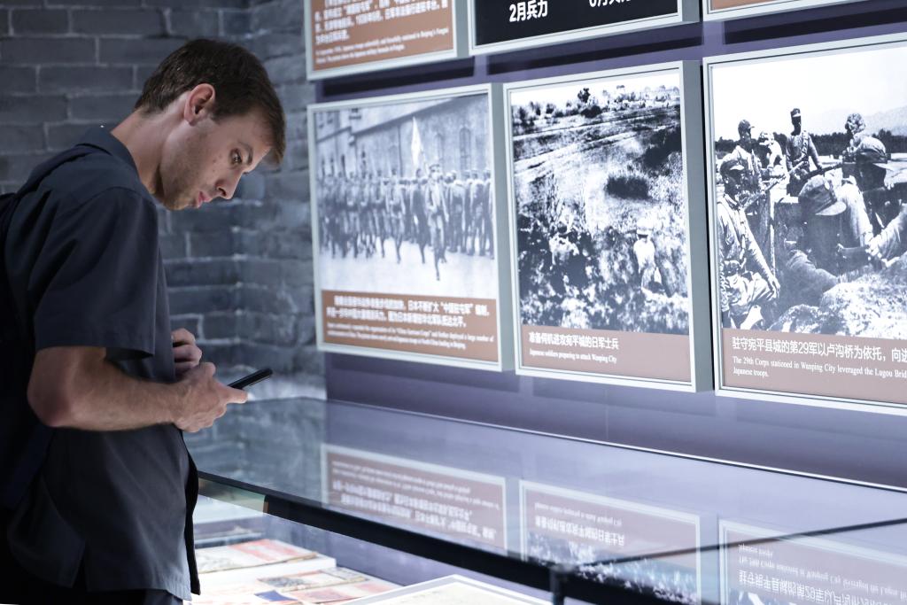 8月27日,一名记者在中国人民抗日战争纪念馆内采访。