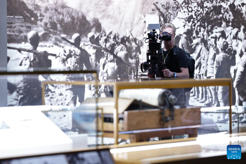 A journalist shoots videos during the visit to the Museum of the War of Chinese People's Resistance Against Japanese Aggression in Beijing, capital of China, Aug. 27, 2025. Nearly 200 journalists went to the Museum of the War of Chinese People's Resistance Against Japanese Aggression for visits and interviews on Wednesday.