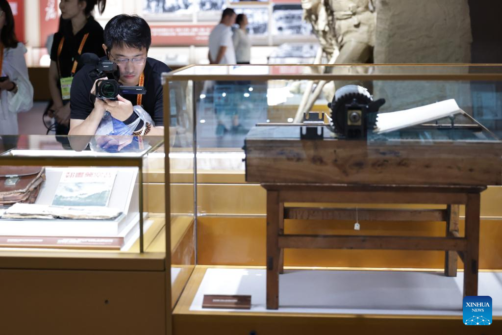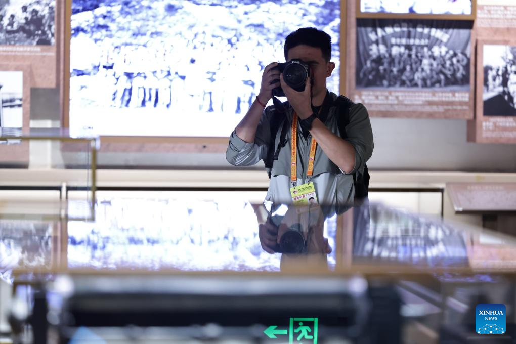 A journalist takes pictures during the visit to the Museum of the War of Chinese People's Resistance Against Japanese Aggression in Beijing, capital of China, Aug. 27, 2025. Nearly 200 journalists went to the Museum of the War of Chinese People's Resistance Against Japanese Aggression for visits and interviews on Wednesday.