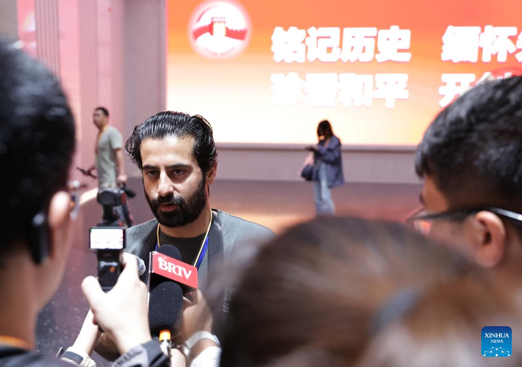 A journalist from Pakistan is interviewed during the visit to the Museum of the War of Chinese People's Resistance Against Japanese Aggression in Beijing, capital of China, Aug. 27, 2025. Nearly 200 journalists went to the Museum of the War of Chinese People's Resistance Against Japanese Aggression for visits and interviews on Wednesday.