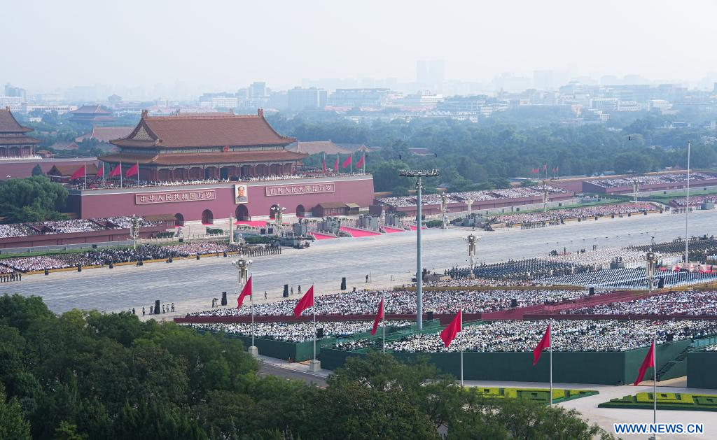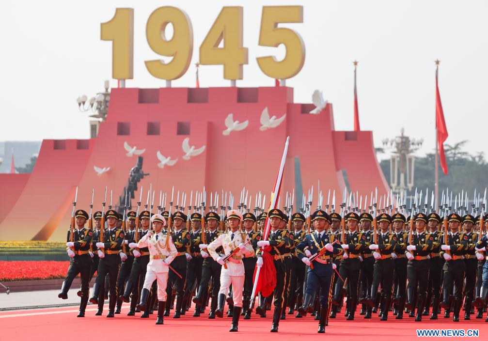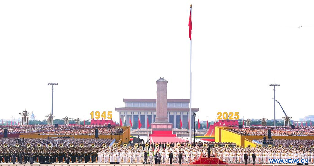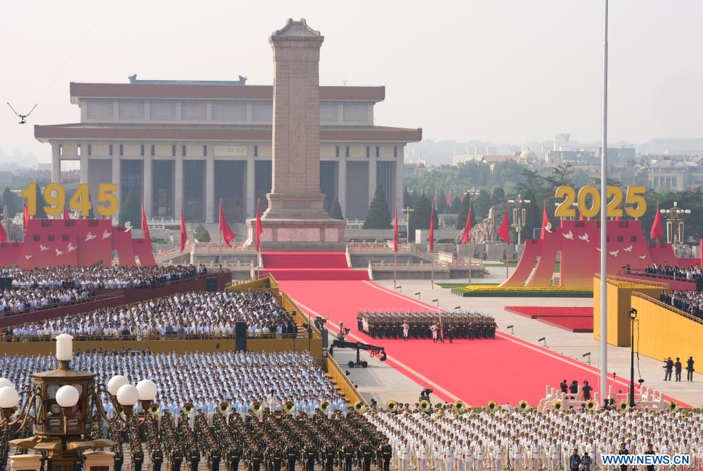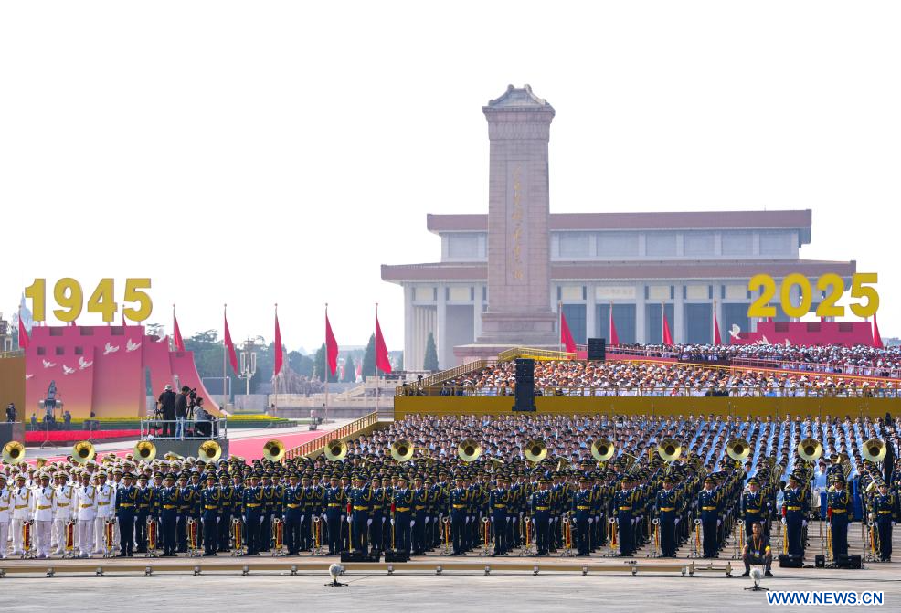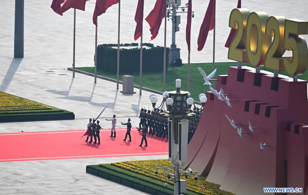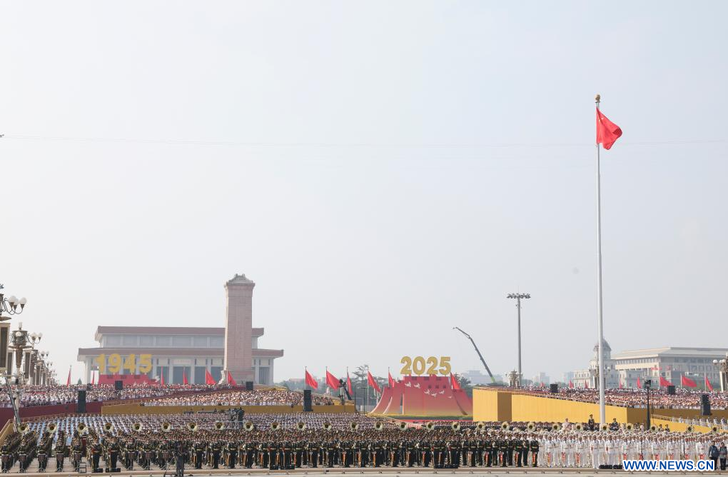 BEIJING, 3 septembre (Xinhua) -- Une grande cérémonie commémorative a commencé mercredi matin sur la place Tian'anmen à Beijing pour marquer le 80e anniversaire de la victoire de la Guerre de résistance du peuple chinois contre l'agression japonaise et de la Guerre mondiale antifasciste.