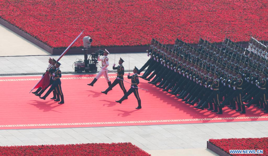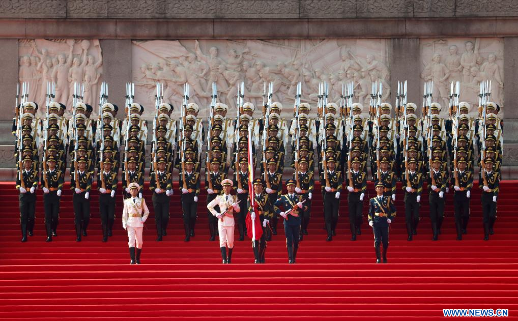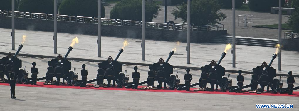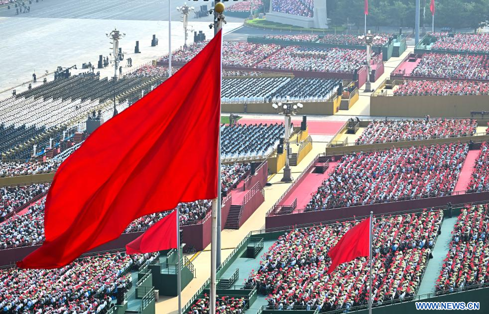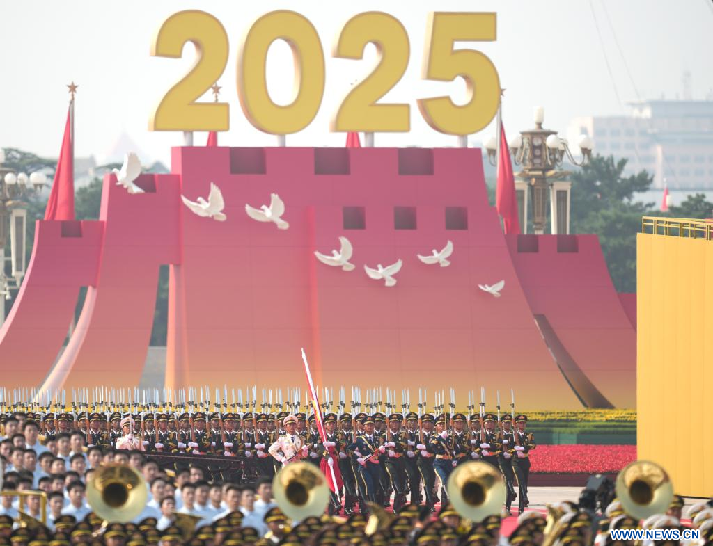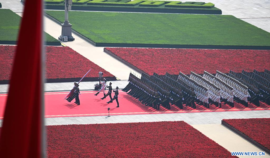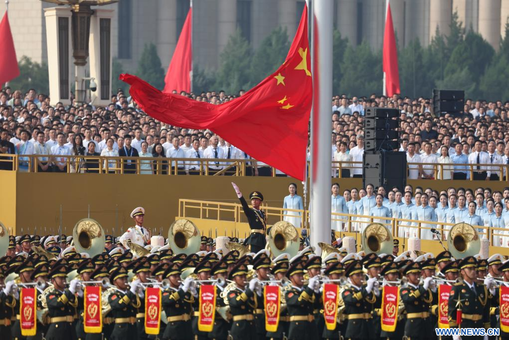 BEIJING, 3 septembre (Xinhua) -- Une grande cérémonie commémorative a commencé mercredi matin sur la place Tian'anmen à Beijing pour marquer le 80e anniversaire de la victoire de la Guerre de résistance du peuple chinois contre l'agression japonaise et de la Guerre mondiale antifasciste.
