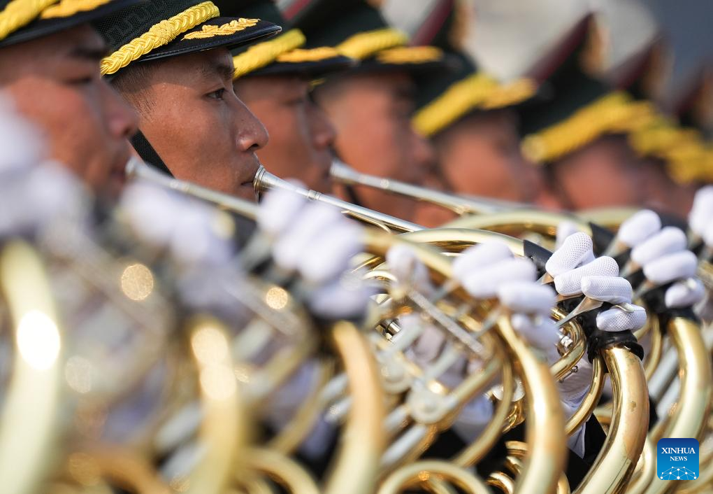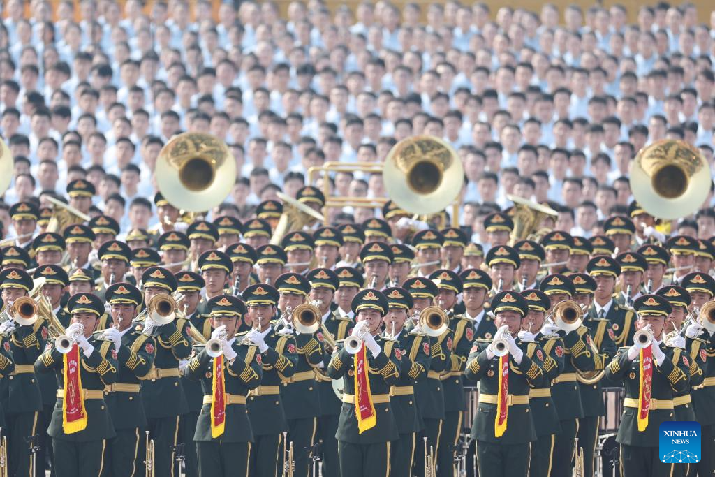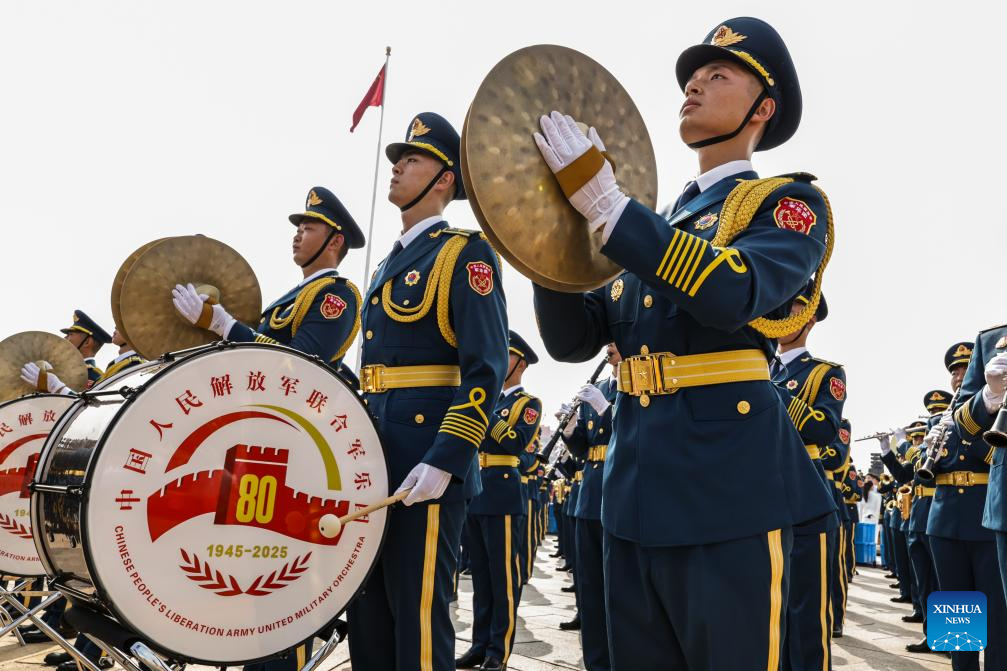 Members of the joint military band of the Chinese People's Liberation Army (PLA) perform during a grand gathering to commemorate the 80th anniversary of the victory in the Chinese People's War of Resistance against Japanese Aggression and the World Anti-Fascist War in Beijing, capital of China, Sept. 3, 2025. (Xinhua/Ou Dongqu)