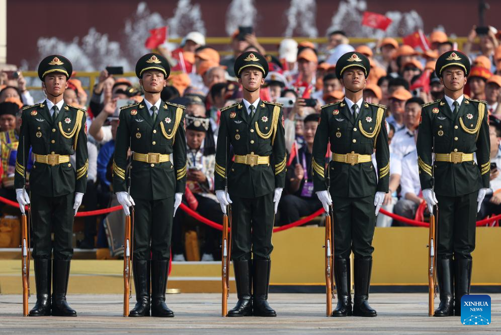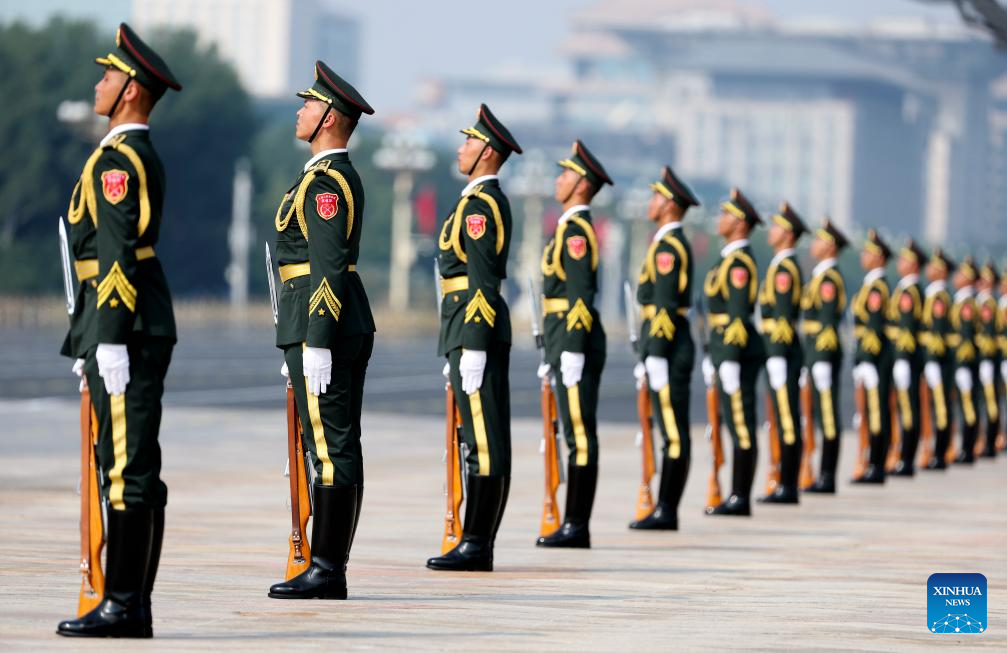 Parade guards stand in place during a grand gathering to commemorate the 80th anniversary of the victory in the Chinese People's War of Resistance against Japanese Aggression and the World Anti-Fascist War in Beijing, capital of China, Sept. 3, 2025. (Xinhua/Chen Cheng)