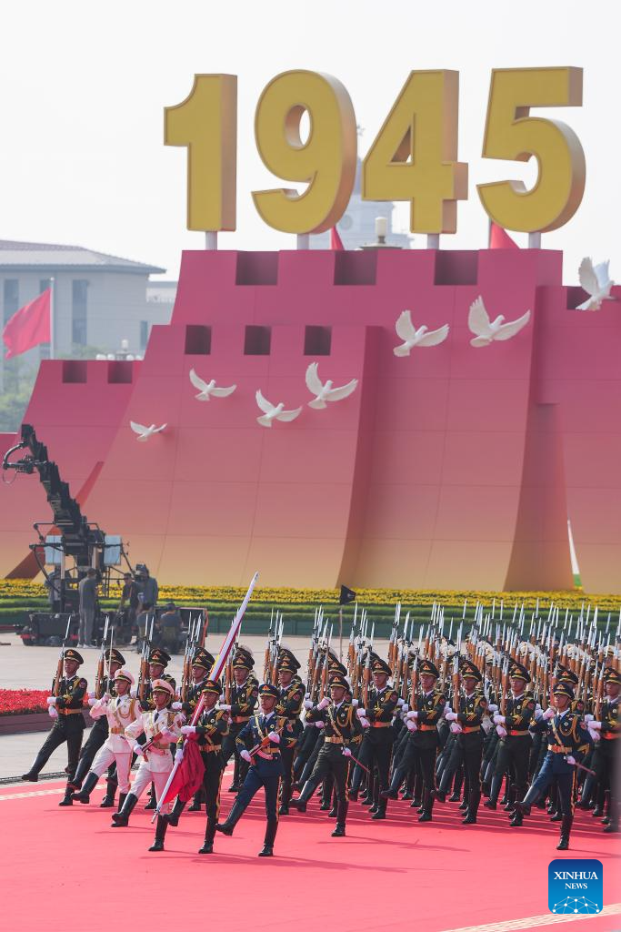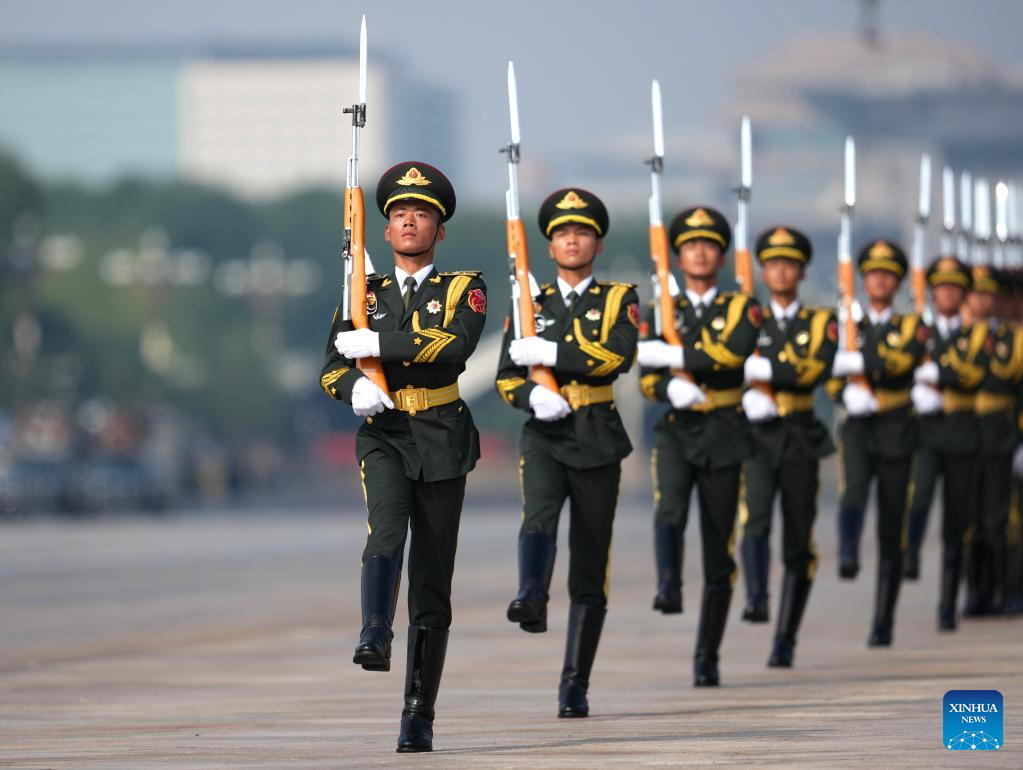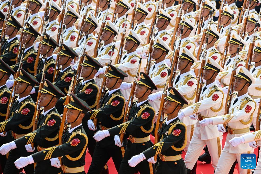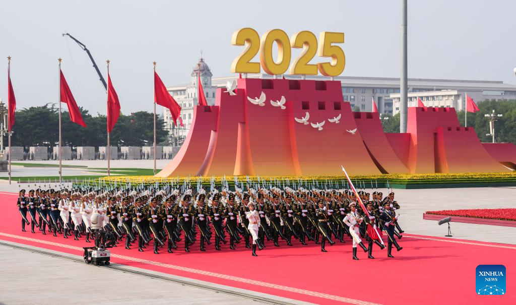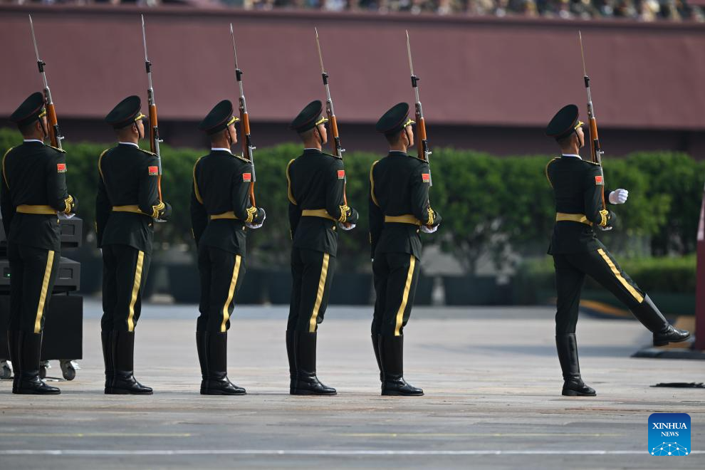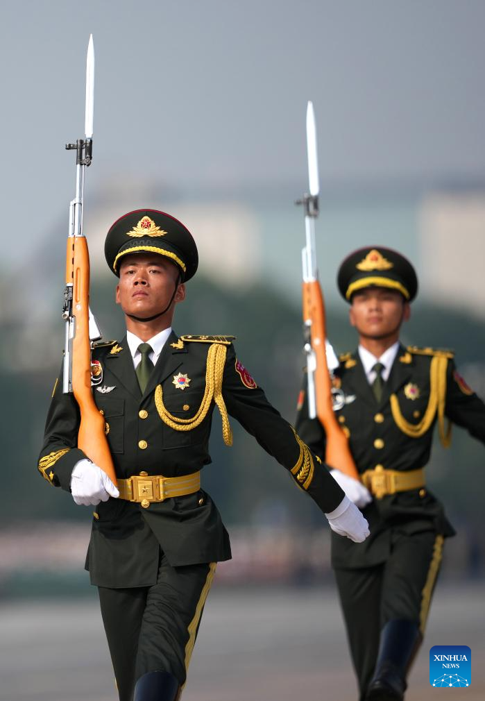 Parade guards step in place during a grand gathering to commemorate the 80th anniversary of the victory in the Chinese People's War of Resistance against Japanese Aggression and the World Anti-Fascist War in Beijing, capital of China, Sept. 3, 2025. (Xinhua/Mao Siqian)