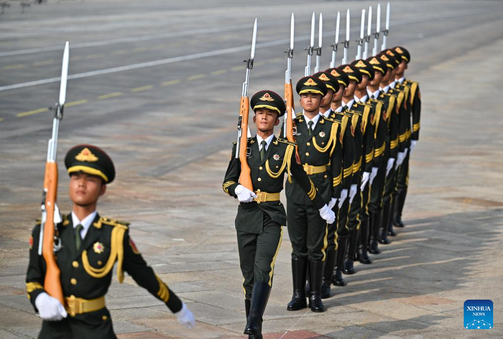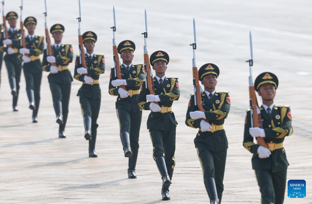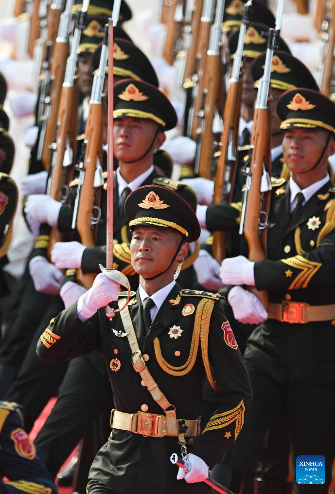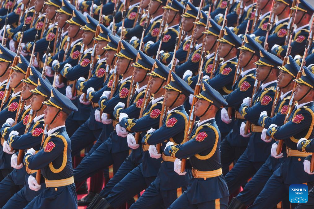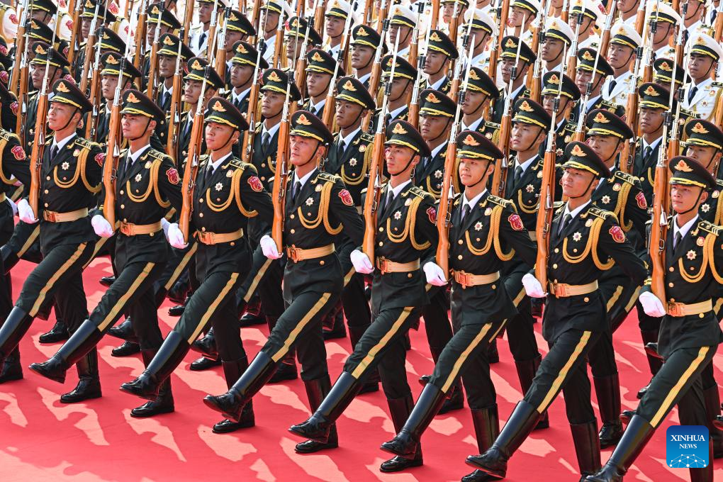 Parade guards step in place during a grand gathering to commemorate the 80th anniversary of the victory in the Chinese People's War of Resistance against Japanese Aggression and the World Anti-Fascist War in Beijing, capital of China, Sept. 3, 2025. (Xinhua/Mao Siqian)