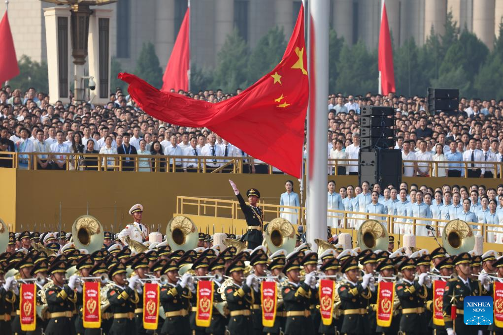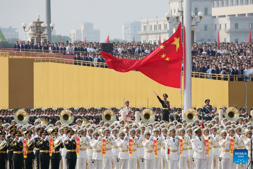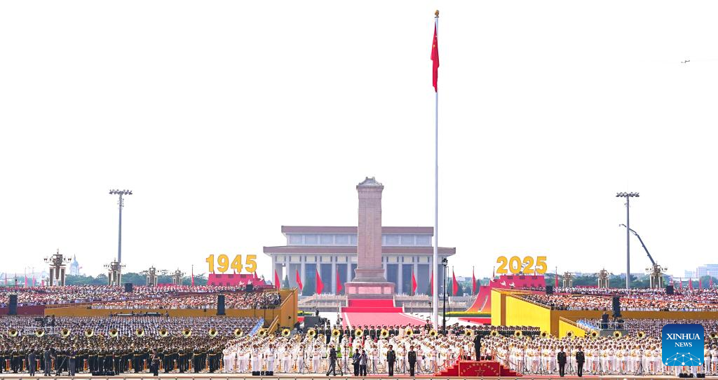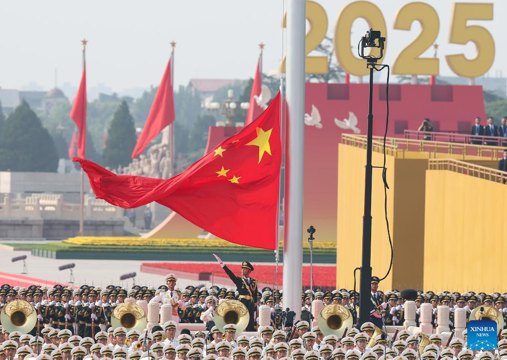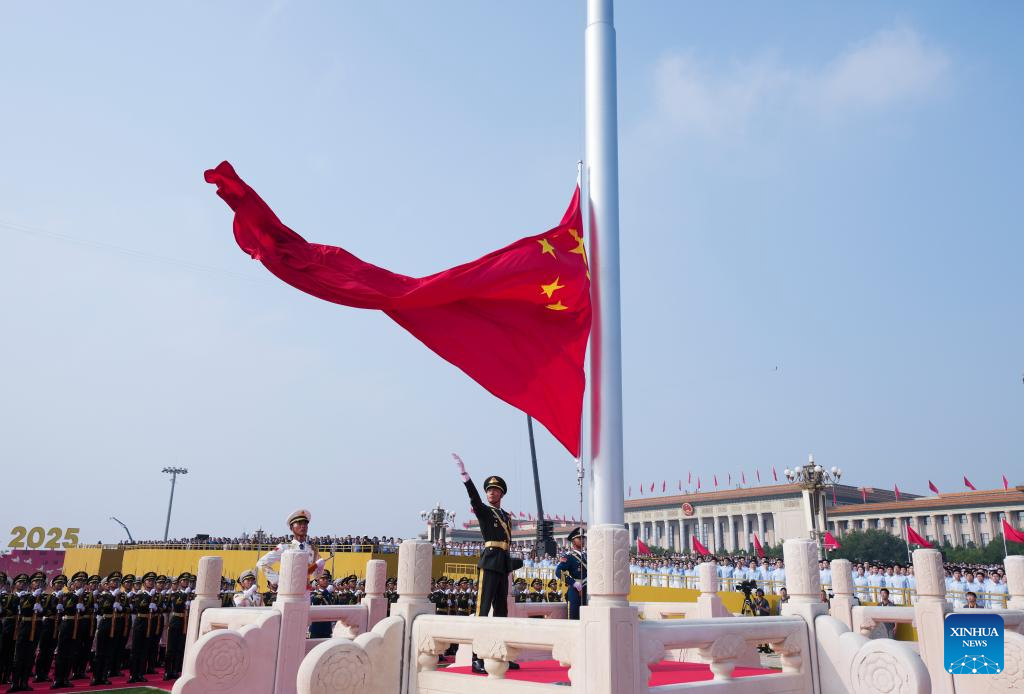A national flag-raising ceremony is held at Tian'anmen Square during a grand gathering to commemorate the 80th anniversary of the victory in the Chinese People's War of Resistance against Japanese Aggression and the World Anti-Fascist War in Beijing, capital of China, Sept. 3, 2025. (Xinhua/Du Yu)
