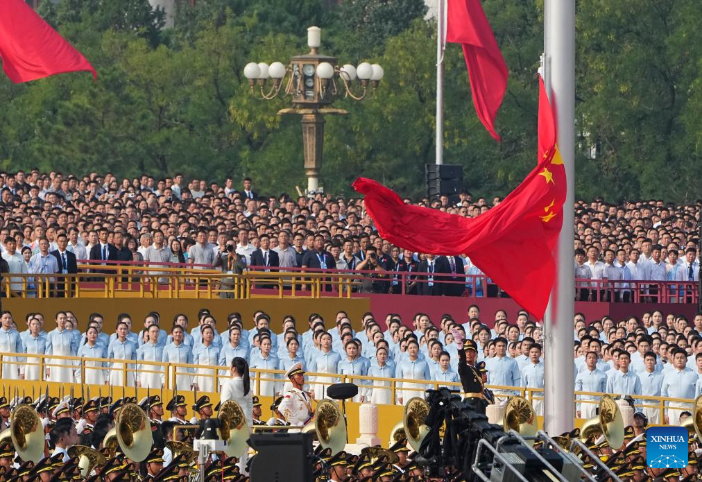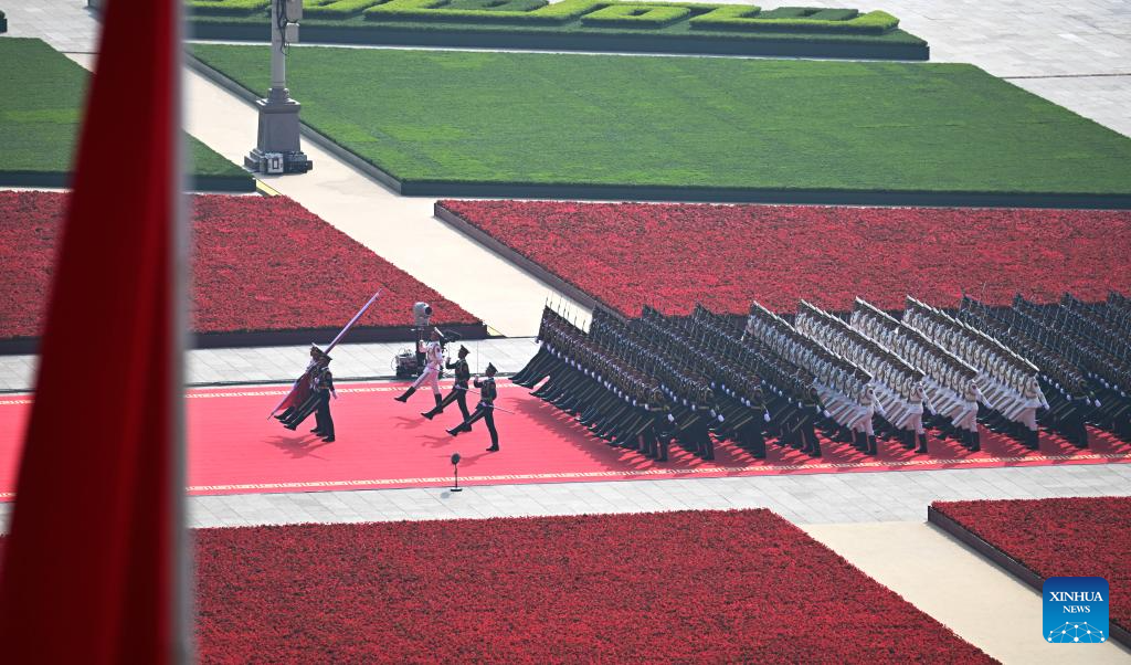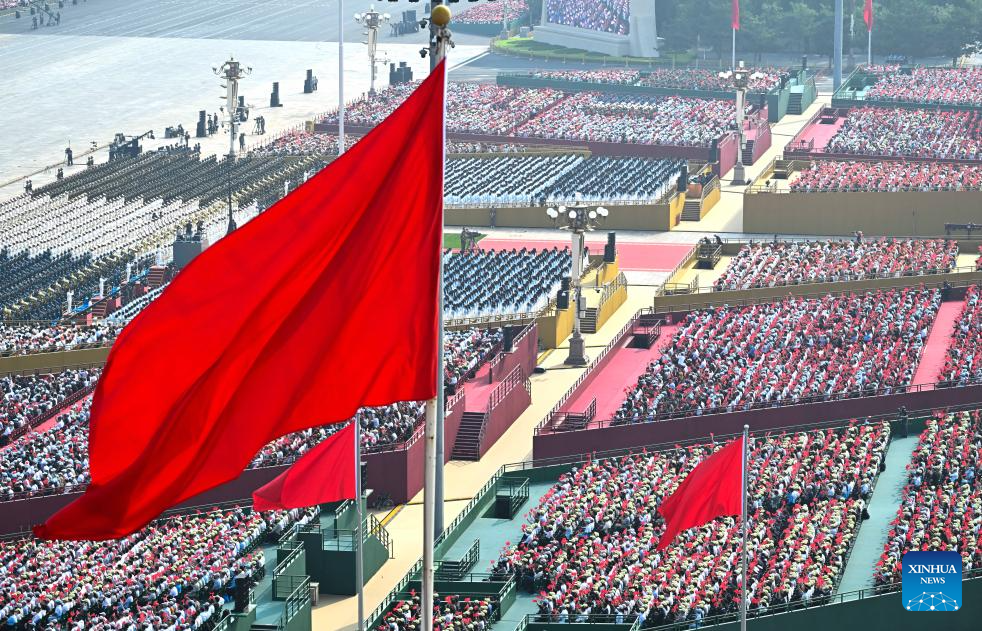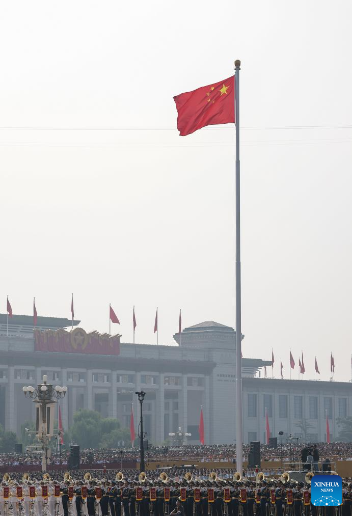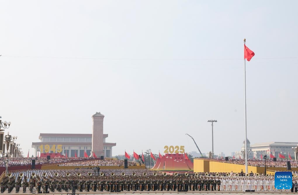 A national flag-raising ceremony is held at Tian'anmen Square during a grand gathering to commemorate the 80th anniversary of the victory in the Chinese People's War of Resistance against Japanese Aggression and the World Anti-Fascist War in Beijing, capital of China, Sept. 3, 2025. (Xinhua/Du Yu)