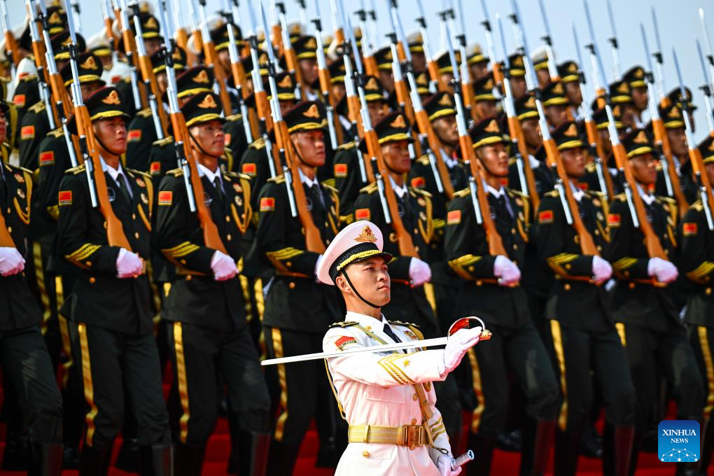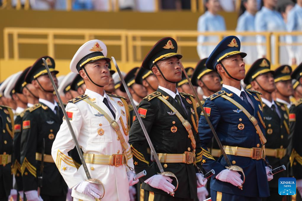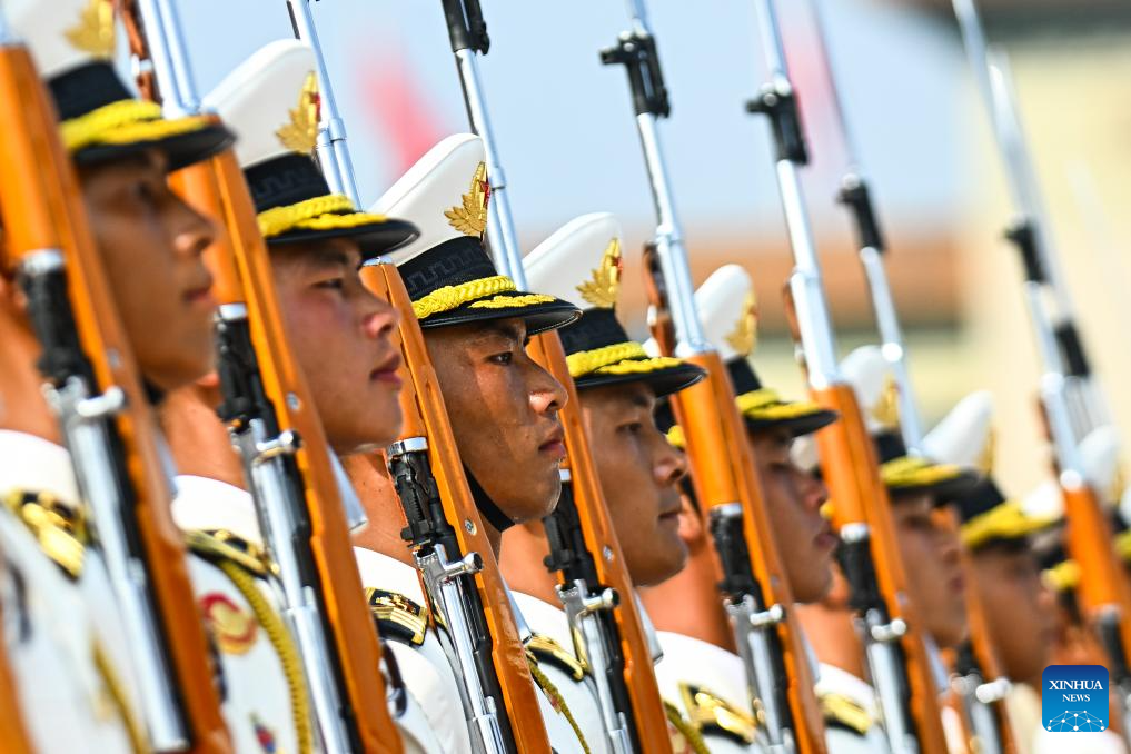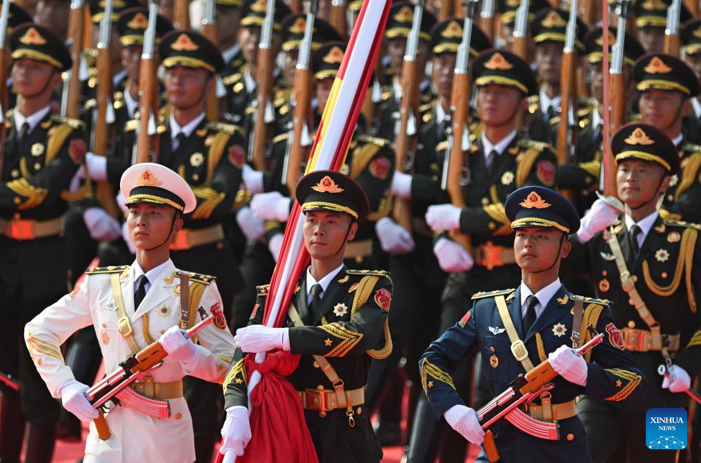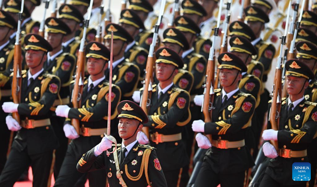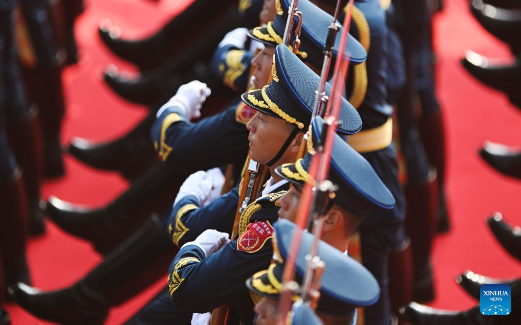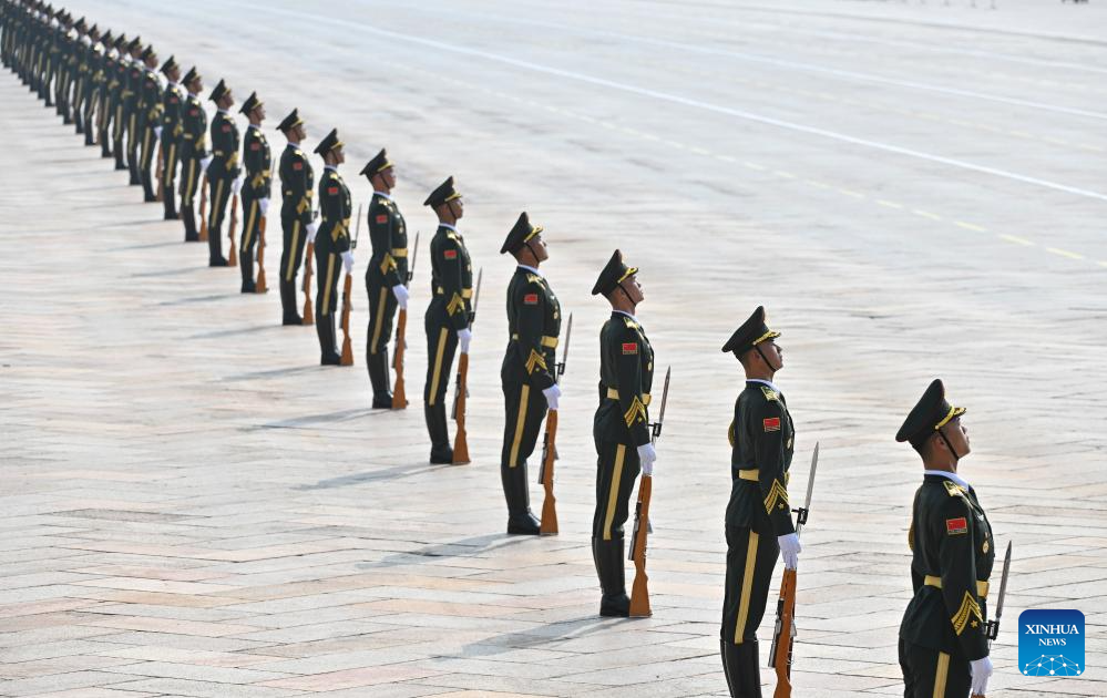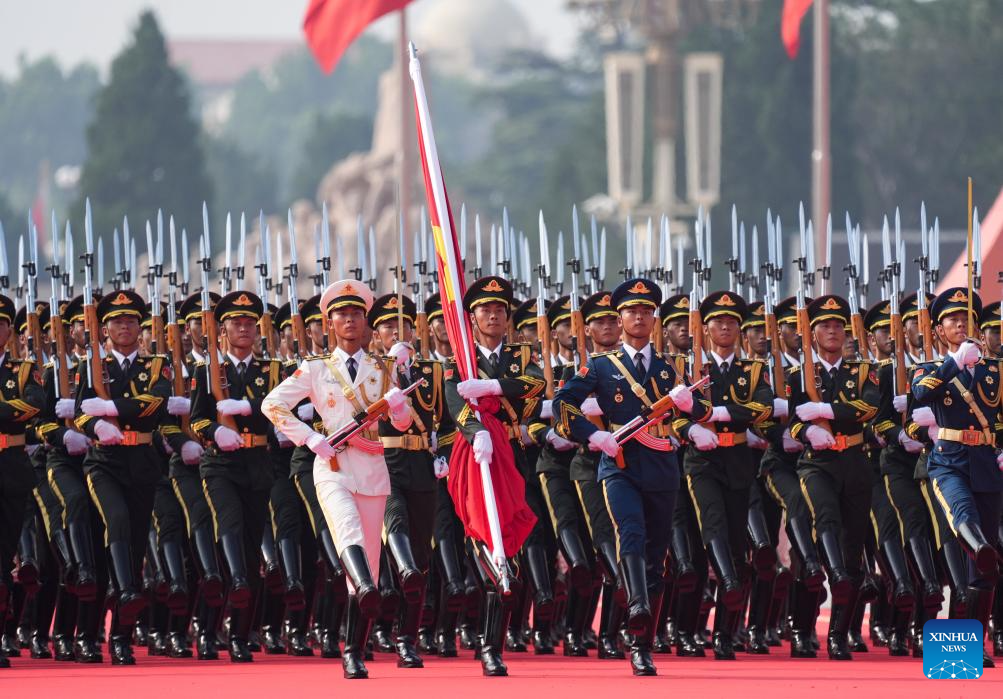 Honor guards stand in formation during a grand gathering to commemorate the 80th anniversary of the victory in the Chinese People's War of Resistance against Japanese Aggression and the World Anti-Fascist War in Beijing, capital of China, Sept. 3, 2025. (Xinhua/Zhang Hongxiang)