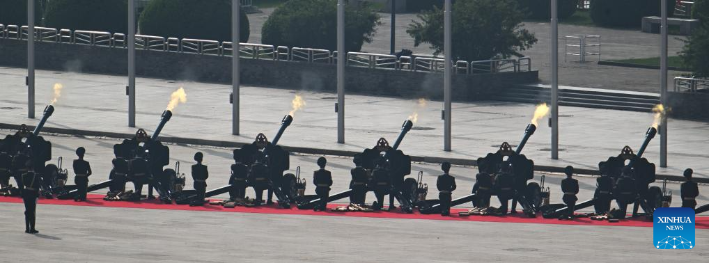 Soldiers fire gun salute during a grand gathering to commemorate the 80th anniversary of the victory in the Chinese People's War of Resistance against Japanese Aggression and the World Anti-Fascist War in Beijing, capital of China, Sept. 3, 2025. (Xinhua/Jiang Wenyao)
