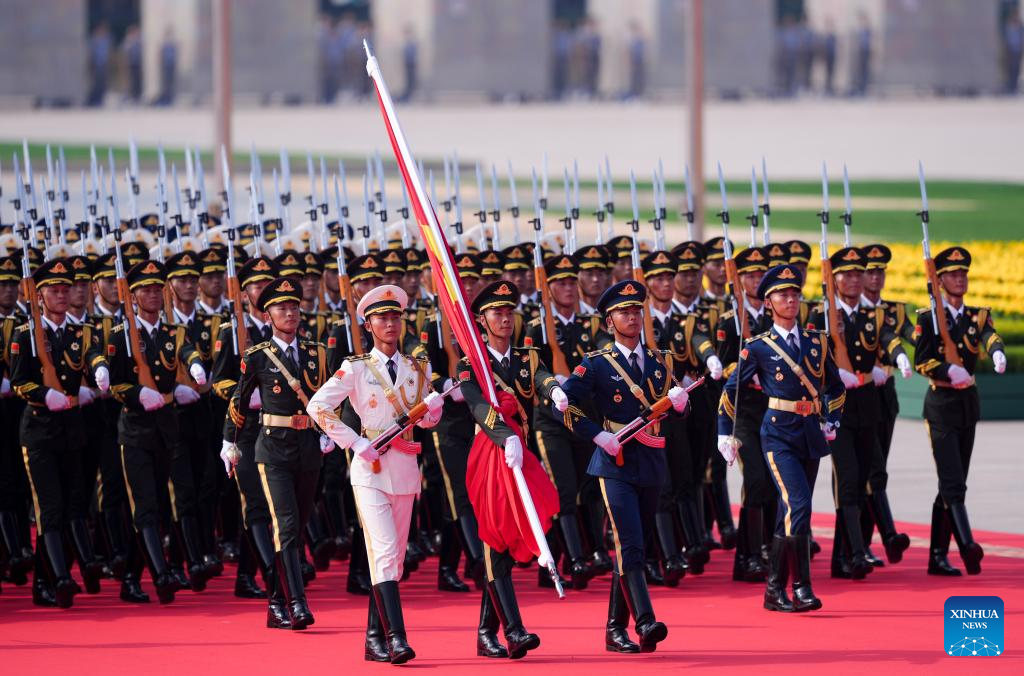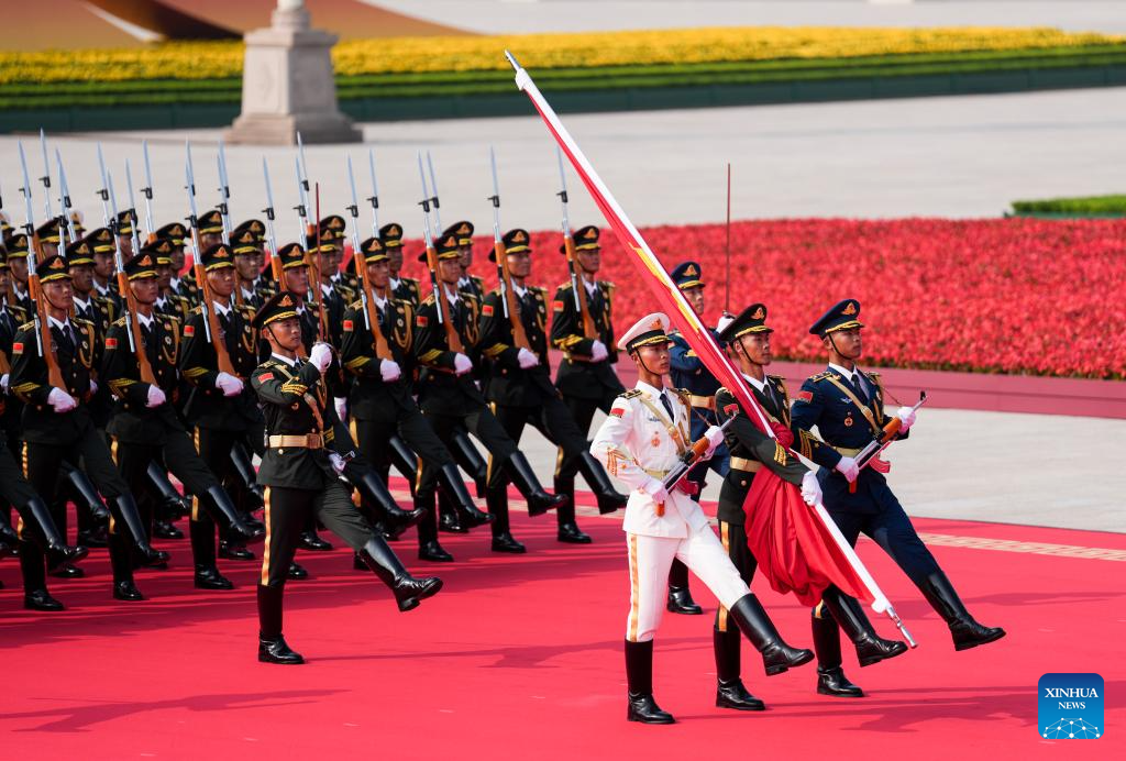 Honor guards escort the Chinese national flag for a flag-raising ceremony during a grand gathering to commemorate the 80th anniversary of the victory in the Chinese People's War of Resistance against Japanese Aggression and the World Anti-Fascist War in Beijing, capital of China, Sept. 3, 2025. (Xinhua/Li An)