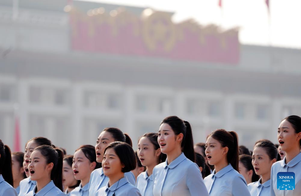 Members of a chorus perform during a grand gathering to commemorate the 80th anniversary of the victory in the Chinese People's War of Resistance against Japanese Aggression and the World Anti-Fascist War in Beijing, capital of China, Sept. 3, 2025. (Xinhua/Du Yu)