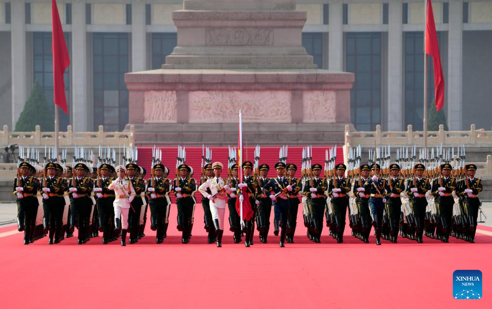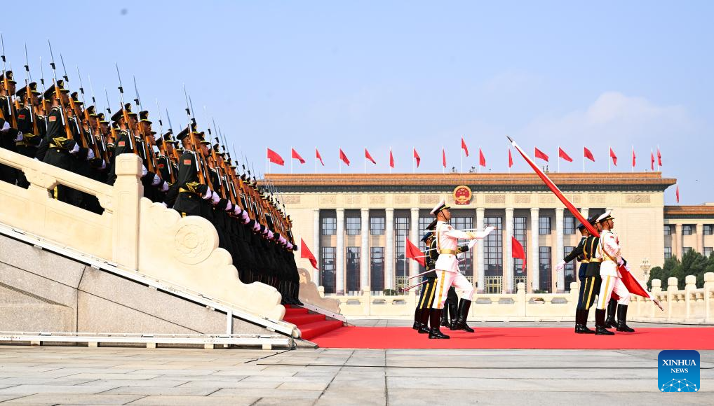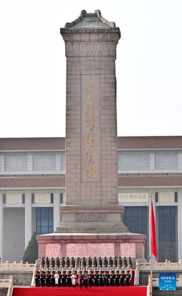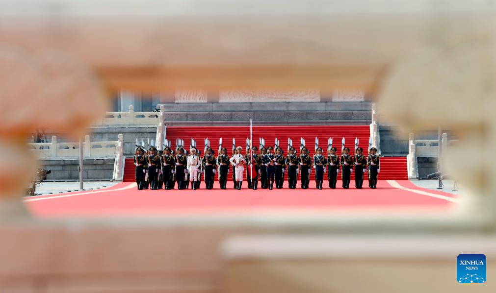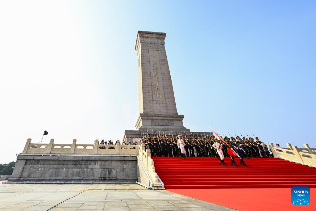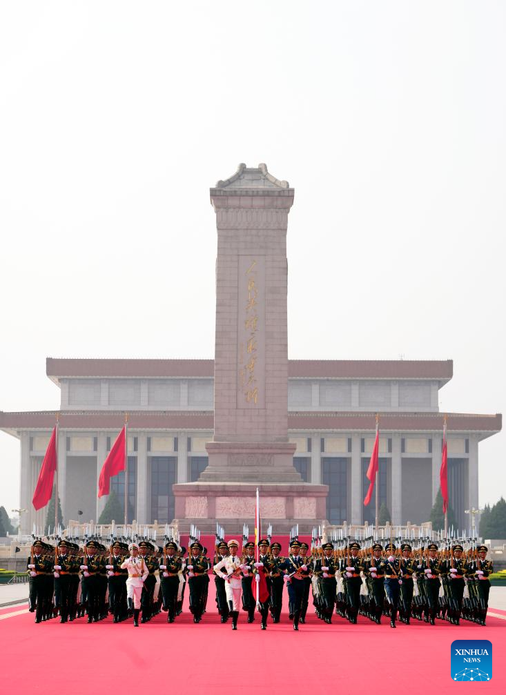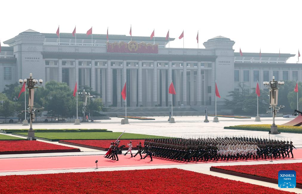 Honor guards escort the Chinese national flag from the Monument to the People's Heroes to the flagpole during a grand gathering to mark the 80th anniversary of the victory in the Chinese People's War of Resistance against Japanese Aggression and the World Anti-Fascist War in Beijing, capital of China, Sept. 3, 2025. (Xinhua/Fei Maohua)