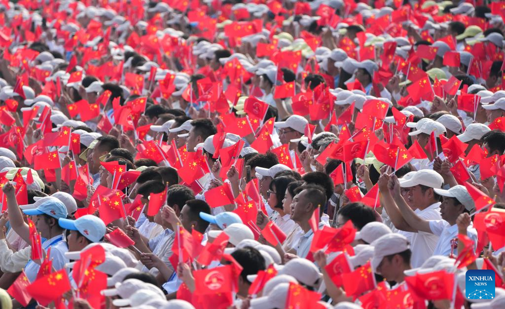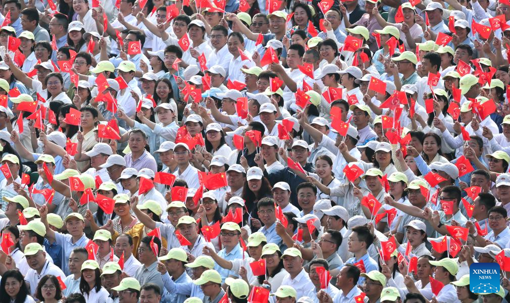 People attend a grand gathering to commemorate the 80th anniversary of the victory in the Chinese People's War of Resistance against Japanese Aggression and the World Anti-Fascist War in Beijing, capital of China, Sept. 3, 2025. (Xinhua/Guo Yu)