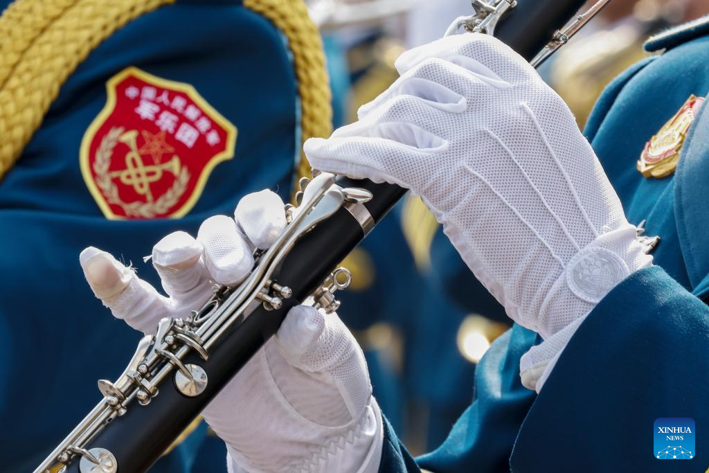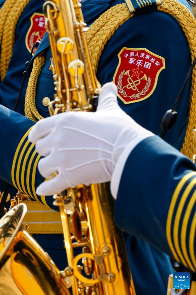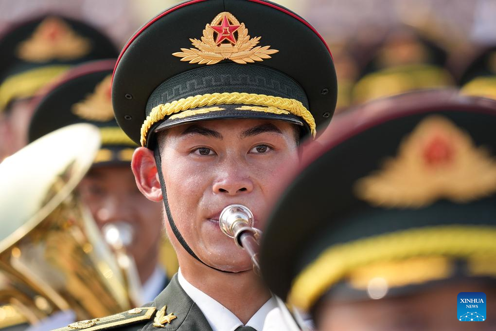 A member of the joint military band of the Chinese People's Liberation Army (PLA) performs during a grand gathering to commemorate the 80th anniversary of the victory in the Chinese People's War of Resistance against Japanese Aggression and the World Anti-Fascist War in Beijing, capital of China, Sept. 3, 2025. (Xinhua/Zhang Yuwei)
