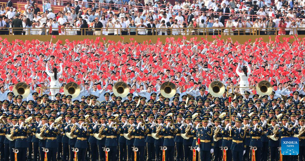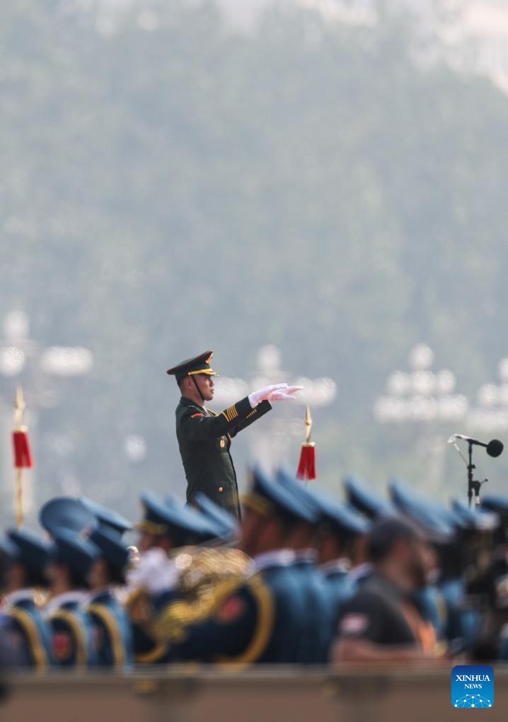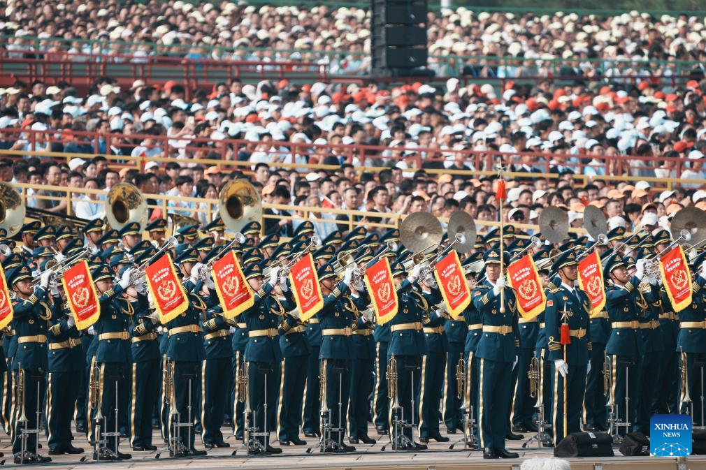 This photo shows members of a joint military band and people attending a grand gathering to commemorate the 80th anniversary of the victory in the Chinese People's War of Resistance against Japanese Aggression and the World Anti-Fascist War in Beijing, capital of China, Sept. 3, 2025. (Xinhua/Ju Huanzong)