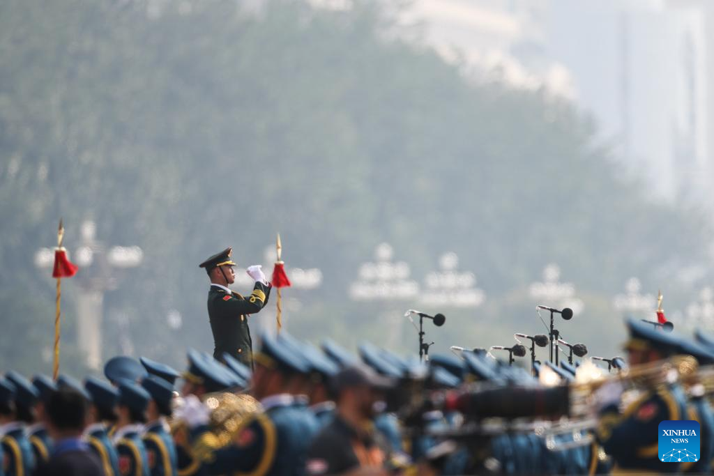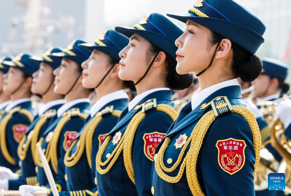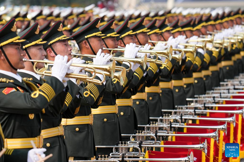 Members of the joint military band of the Chinese People's Liberation Army (PLA) perform during a grand gathering to commemorate the 80th anniversary of the victory in the Chinese People's War of Resistance against Japanese Aggression and the World Anti-Fascist War in Beijing, capital of China, Sept. 3, 2025. (Xinhua/Zhang Yuwei)