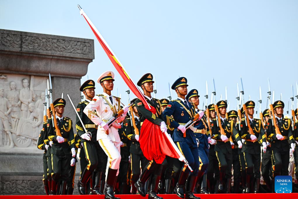 Soldiers escort the Chinese national flag for a flag-raising ceremony during a grand gathering to commemorate the 80th anniversary of the victory in the Chinese People's War of Resistance against Japanese Aggression and the World Anti-Fascist War, in Beijing, capital of China, Sept. 3, 2025. (Xinhua/Li Xiang)