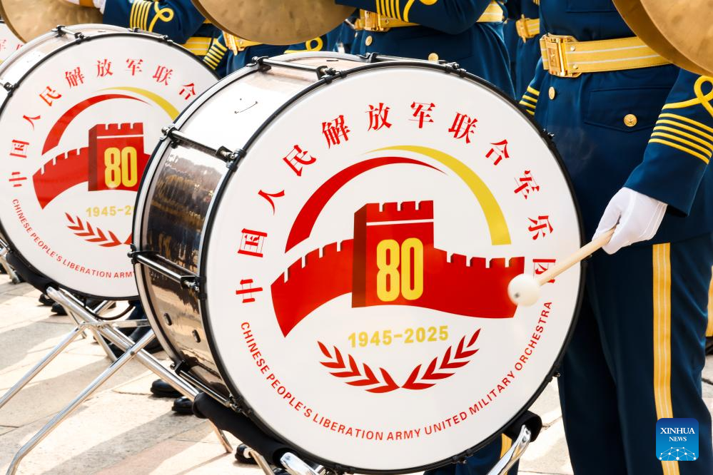 Members of the joint military band of the Chinese People's Liberation Army (PLA) perform during a grand gathering to commemorate the 80th anniversary of the victory in the Chinese People's War of Resistance against Japanese Aggression and the World Anti-Fascist War in Beijing, capital of China, Sept. 3, 2025. (Xinhua/Wan Xiang)