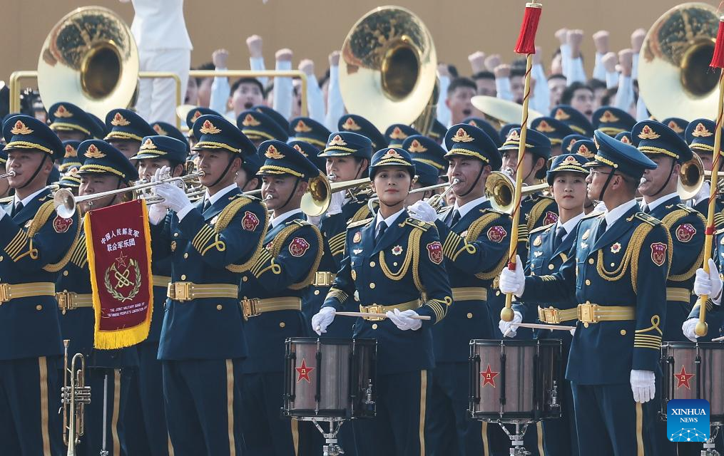 Members of the joint military band of the Chinese People's Liberation Army (PLA) perform during a grand gathering to commemorate the 80th anniversary of the victory in the Chinese People's War of Resistance against Japanese Aggression and the World Anti-Fascist War in Beijing, capital of China, Sept. 3, 2025. (Xinhua/Huang Zongzhi)