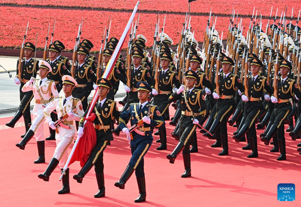 Honor guards escort the Chinese national flag for a flag-raising ceremony during a grand gathering to commemorate the 80th anniversary of the victory in the Chinese People's War of Resistance against Japanese Aggression and the World Anti-Fascist War in Beijing, capital of China, Sept. 3, 2025. (Xinhua/Zhang Tao)