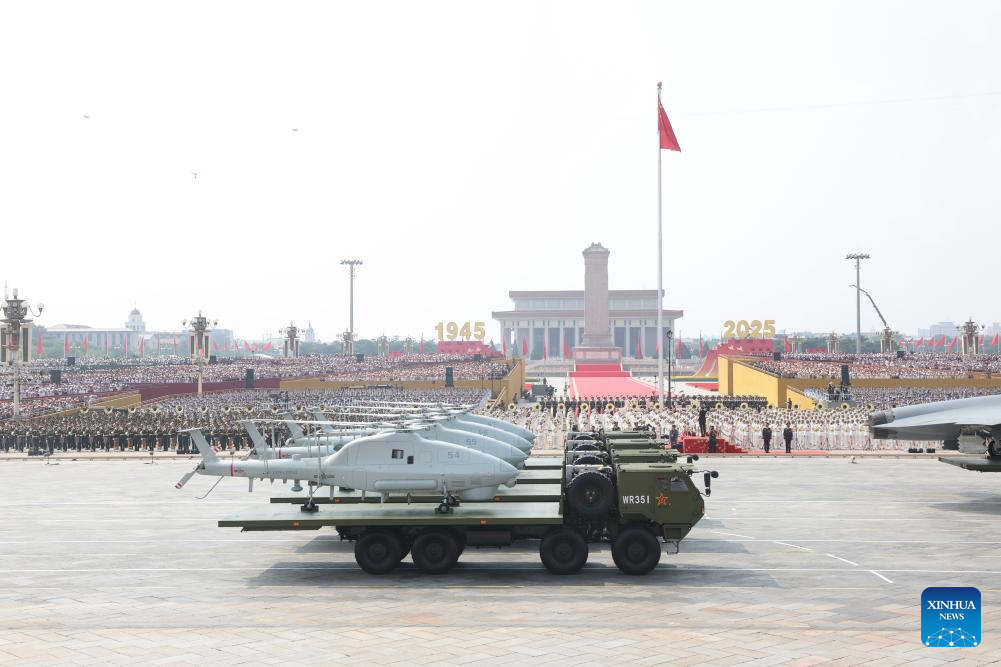 The airborne unmanned warfare formation attends a military parade in Beijing, capital of China, Sept. 3, 2025. China on Wednesday held a grand gathering to commemorate the 80th anniversary of the victory in the Chinese People's War of Resistance against Japanese Aggression and the World Anti-Fascist War. (Xinhua/Chen Bin)