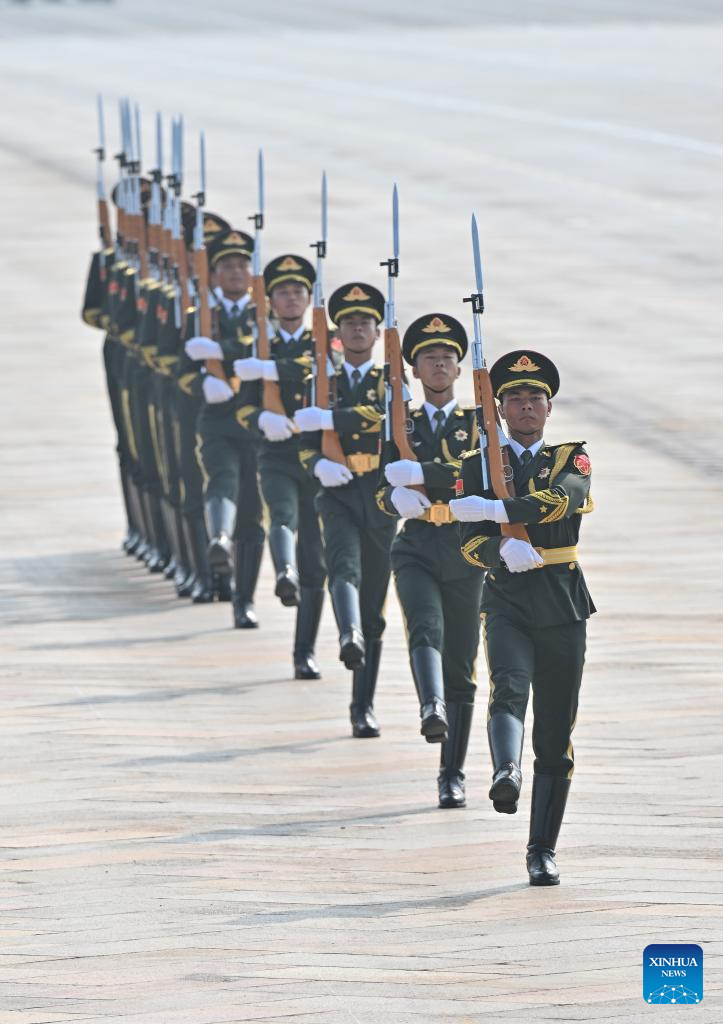 Honor guards escort the Chinese national flag from the Monument to the People's Heroes to the flagpole during a grand gathering to mark the 80th anniversary of the victory in the Chinese People's War of Resistance against Japanese Aggression and the World Anti-Fascist War in Beijing, capital of China, Sept. 3, 2025. (Xinhua/Fei Maohua)