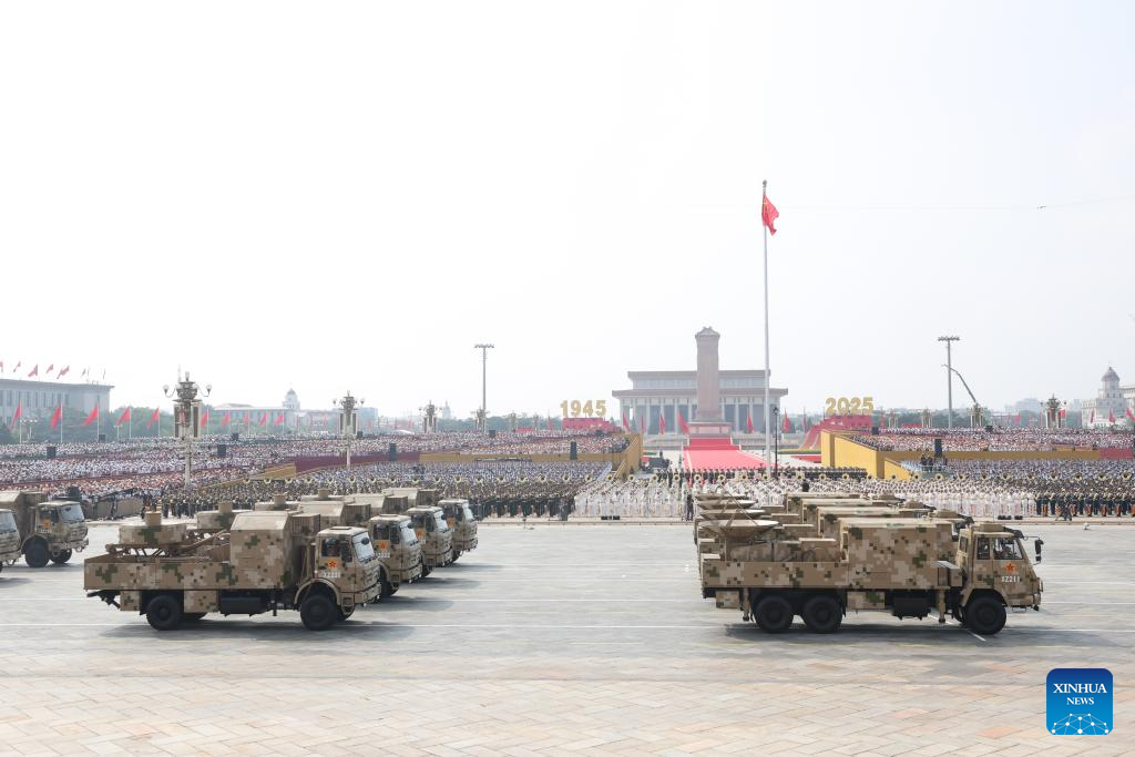 The air defense weaponry formation attends a military parade in Beijing, capital of China, Sept. 3, 2025. China on Wednesday held a grand gathering to commemorate the 80th anniversary of the victory in the Chinese People's War of Resistance against Japanese Aggression and the World Anti-Fascist War. (Xinhua/Zhang Tao)