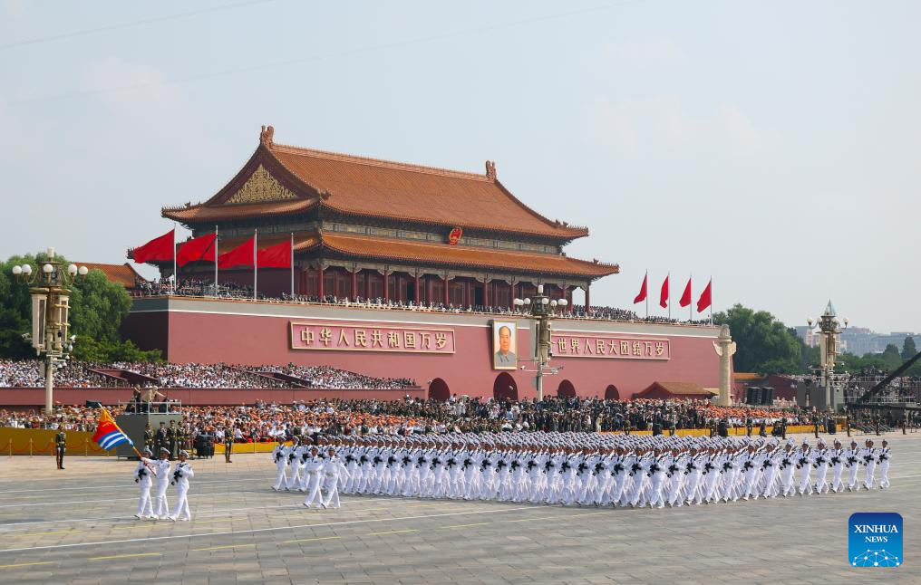 The formation of the Chinese People's Liberation Army Navy marches through Tian'anmen Square during a military parade in Beijing, capital of China, Sept. 3, 2025. China on Wednesday held a grand gathering to commemorate the 80th anniversary of the victory in the Chinese People's War of Resistance against Japanese Aggression and the World Anti-Fascist War. (Xinhua/Xia Yifang)