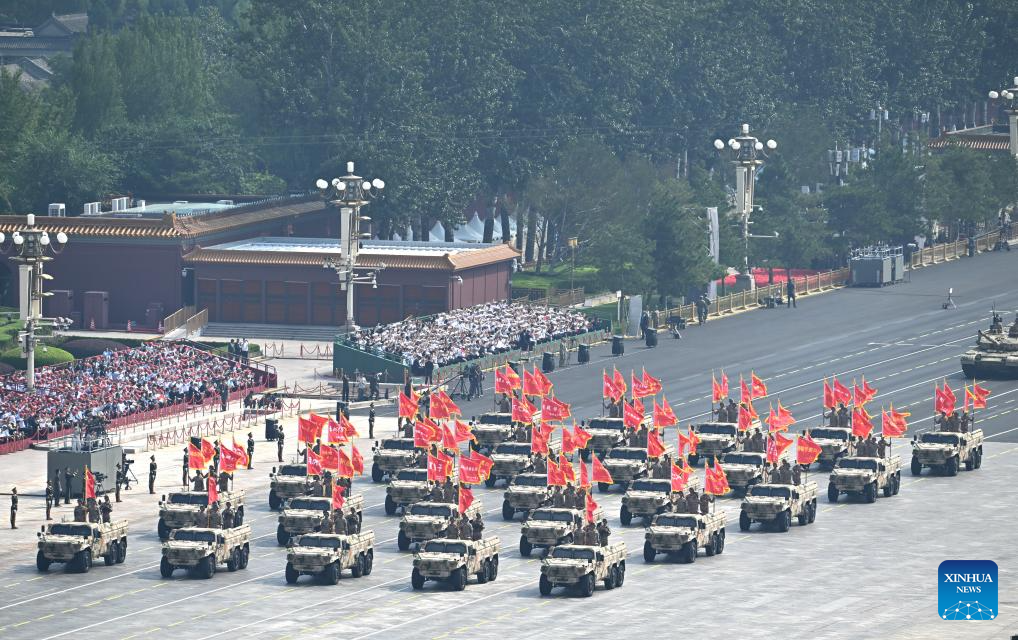 Foot formations attend a military parade in Beijing, capital of China, Sept. 3, 2025. China on Wednesday held a grand gathering to commemorate the 80th anniversary of the victory in the Chinese People's War of Resistance against Japanese Aggression and the World Anti-Fascist War. (Xinhua/Xiong Qi)