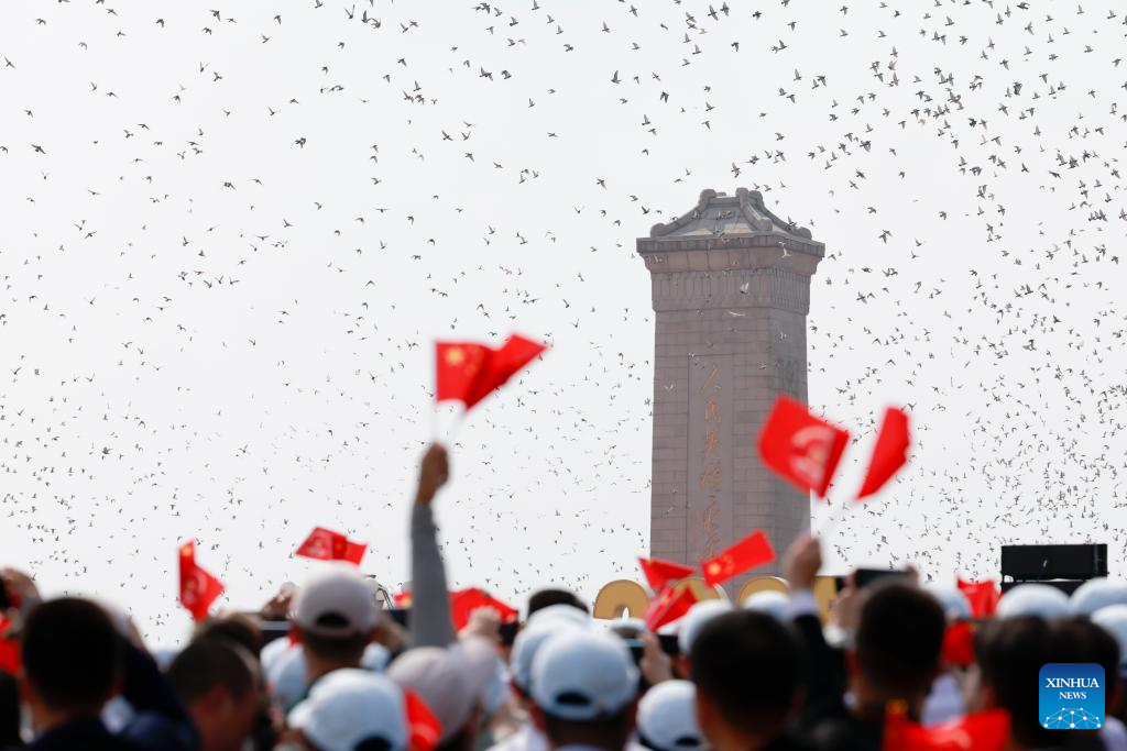 Pigeons and balloons are released during a grand gathering to commemorate the 80th anniversary of the victory in the Chinese People's War of Resistance against Japanese Aggression and the World Anti-Fascist War in Beijing, capital of China, Sept. 3, 2025. (Xinhua/Ma Ning)