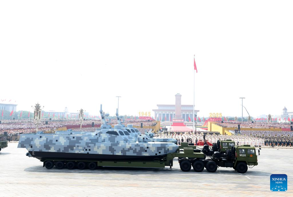 The sea-based unmanned warfare formation attends a military parade in Beijing, capital of China, Sept. 3, 2025. China on Wednesday held a grand gathering to commemorate the 80th anniversary of the victory in the Chinese People's War of Resistance against Japanese Aggression and the World Anti-Fascist War. (Xinhua/Deng Hua)